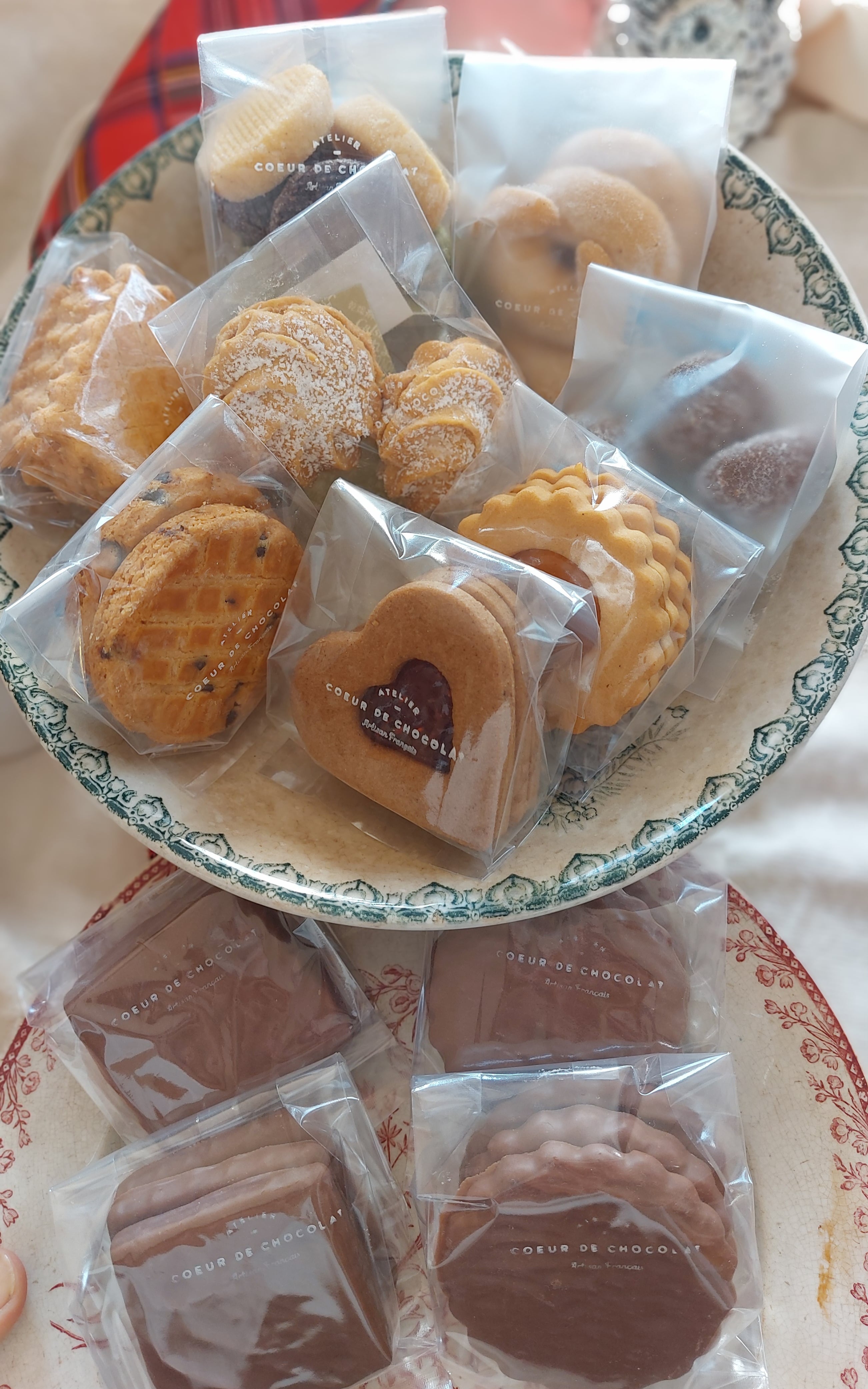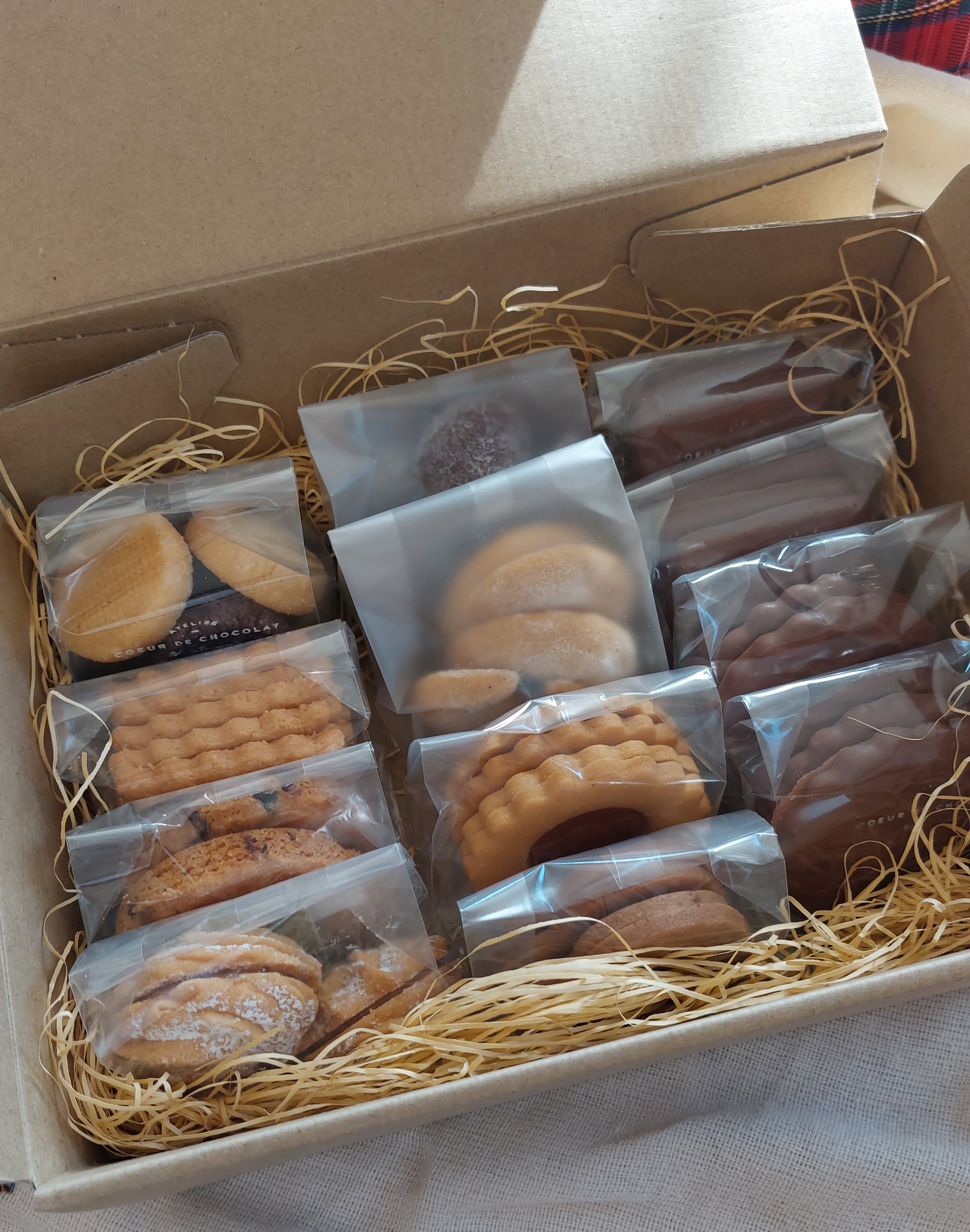 【商品内容】 ■ディアモン(カカオ・抹茶・バニラ)X 1 ■ガレット ブルトン チョコチップ X 1 ■ビスキュイ クール フランボワーズ (シナモン&ラズベリー) ■ビスキュイ アプリコ(杏) ■サブレ シトロン&ジャンドゥーヤ(自家製ジャンドゥーヤ、レモン) ■ブル ドゥ ノアゼット → プチ エコリエに変更 X 1 ■サブレ ナンテ(バター) X 1 ■バニーキプフェル(へーセルナッツ&アーモンド) X 1 ■ビスキュイ ノア(シナモン、クルミ、レモン)X1 ■ビスキュイ ショコラ(アーモンド、ヘーゼルナッツのカカオ生地) 【原材料名】 小麦粉(国内製造)、バター、砂糖、卵、ヘーゼルナッツ、アーモンド、 ミルクチョコ、カカオパウダー、ココナッツ、ラズベリー、レモン、苺、杏 クルミ、ビターチョコ、抹茶、膨張剤(アルミニウムフリー)、 バニラ、シナモン、ラム酒、塩、ペクチン 【原材料に含まれるアレルギー物質(27品目中)】 卵 /小麦/ 乳/ 大豆/ アーモンド/ クルミ -------------------------------- 【保存方法】 直射日光、高温多湿を避け、涼しい所にて保存してください。 【賞味期限】 クッキー類は製造日から約15日前後 ※賞味期限は涼しい場所で未開封のまま保存した場合に限ります。 ※開封後はお早めにお召し上がりください。