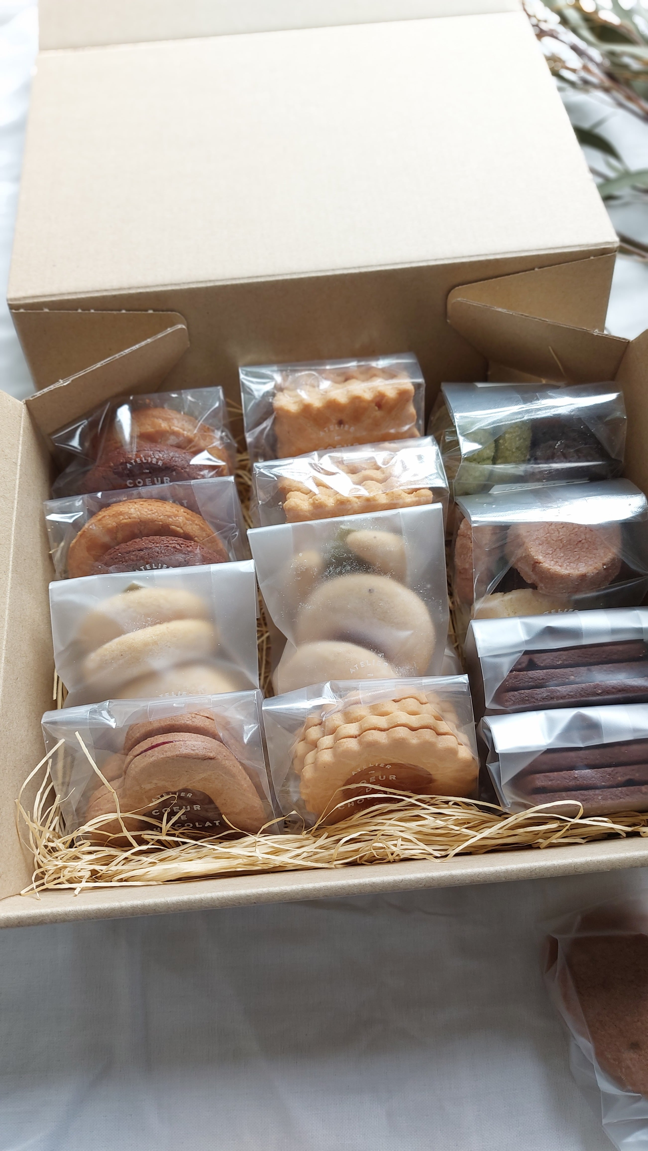 【商品内容】 ■ディアモン(カカオ・抹茶・バニラ) ■ディアモン(バニラ・苺) ■ビスキュイ クール フランボワーズ (シナモン&ラズベリー) ■ビスキュイ アプリコ(杏) ■ビスキュイ カカオ(アーモンド&カカオ) X 2 ■ガレット ブルトンヌ(バニラ&カカオ)X 2 ■サブレ ナンテ(バター) X 2 ■バニーキプフェル(へーセルナッツ&アーモンド) X 2 【原材料名】 小麦粉(国内製造)、バター、砂糖、卵、アーモンド、ヘーゼルナッツ、 カカオパウダー、ココナッツ、ラズベリー、レモン、苺、杏 抹茶、フリーズドライ苺、膨張剤(アルミニウムフリー)、 バニラ、シナモン、ラム酒、塩、ペクチン 【原材料に含まれるアレルギー物質(27品目中)】 卵 /小麦/ 乳/ 大豆/ アーモンド ----------------------------------- 【保存方法】 直射日光、高温多湿を避け、涼しい所にて保存してください。 【賞味期限】 クッキー類は製造日から約15日前後 ※賞味期限は涼しい場所で未開封のまま保存した場合に限ります。 ※開封後はお早めにお召し上がりください。